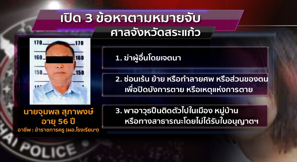 สำหรับข้อกล่าวหานายจุมพล ตามหมายจับศาลจังหวัดสระแก้ว ประกอบด้วย 1.ฆ่าผู้อื่นโดยเจตนา 2.ซ่อนเร้นย้าย หรือทำลายศพ หรือส่วนของตน เพื่อปิดบังการตาย หรือเหตุแห่งการตาย และ 3.พาอาวุธปืนติดตัวไปในเมือง หมู่บ้าน หรือทางสาธารณะโดยไม่ได้รับใบอนญาตฯ