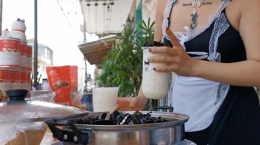 ประจวบคีรีขันธ์ 19 ก.พ.- อาหมวยแต่งชุดคอสเพลย์ขายเฉาก๊วยนมสด ยอดพุ่งกระฉูดวันละ 200 แก้ว ลูกค้าทุกเพศทุกวัย มารอซื้อกันเพียบ