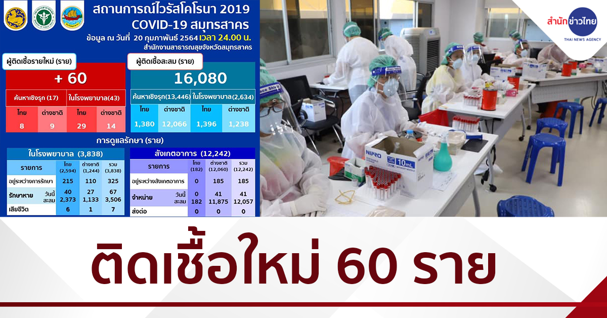 สมุทรสาคร 21 ก.พ.- สถานการณ์การติดเชื้อโควิด-19 สมุทรสาคร วันนี้ พบผู้ติดเชื้อรายใหม่ 60 ราย ในจำนวนนี้เป็นการค้นหาเชิงรุก 17 ราย ขณะที่ยอดป่วยยืนยันสะสม 16,080 ราย