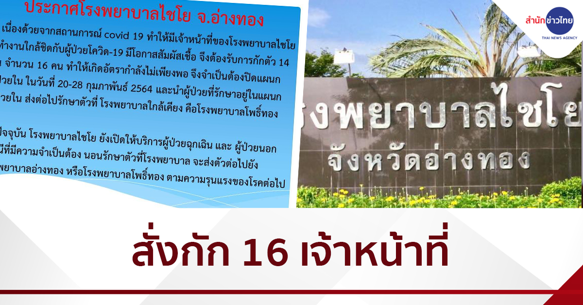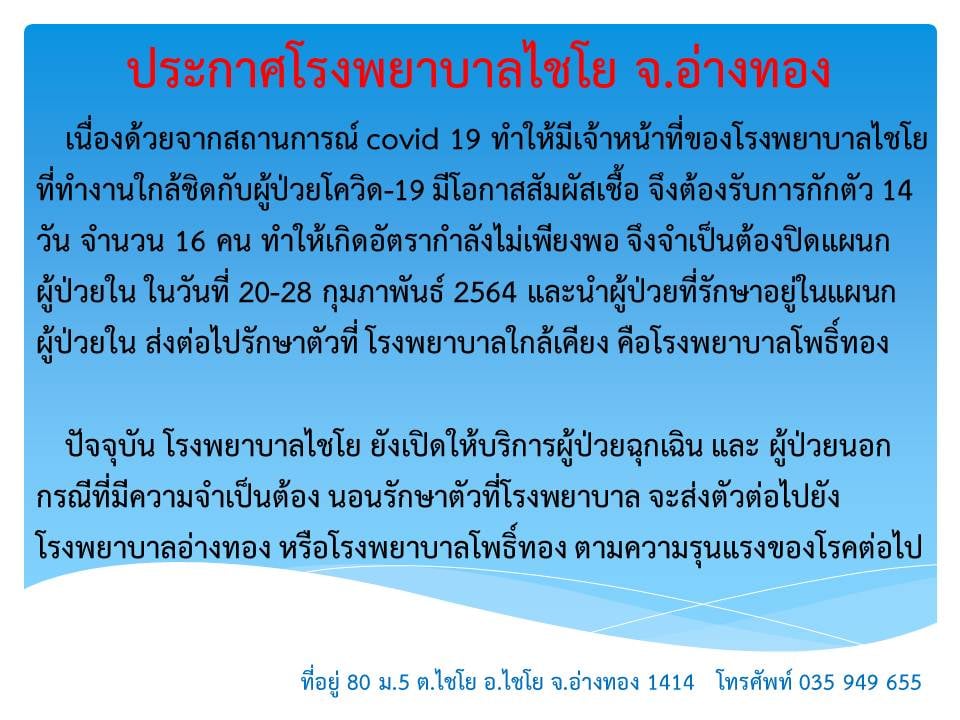 โรงพยาบาลไชโย จังหวัดอ่างทอง ออกประกาศเรื่องสถานการณ์ COVID-19 เนื่องด้วยสถานการณ์โควิด-19 ทำให้มีเจ้าหน้าที่ของโรงพยาบาลไชโย ที่ทำงานใกล้ชิดกับผู้ป่วยโควิด-19 มีโอกาสสัมผัสเชื้อ จึงต้องรับการกักตัว 14 วัน จำนวน 16 คน