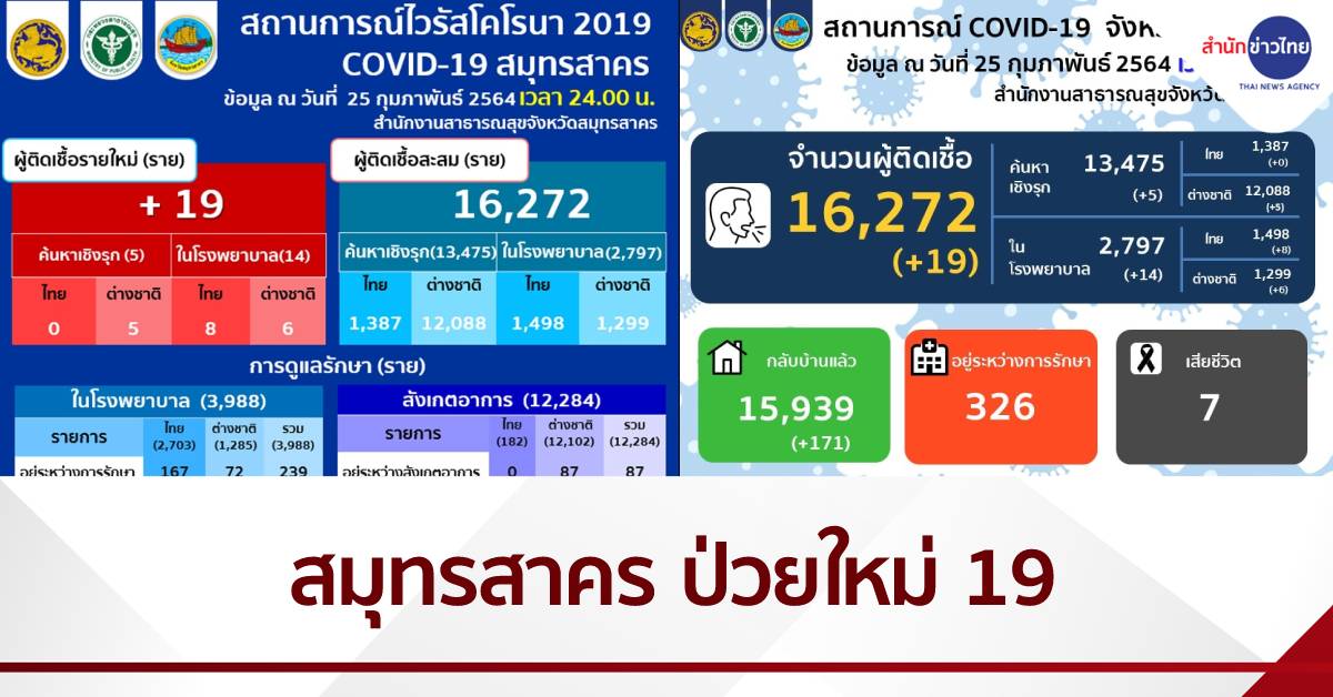 รายงานสถานการณ์การระบาดของเชื้อไวรัสโคโรนา 2019 ( COVID 19) จ.สมุทรสาคร เมื่อเวลา 24.00 น. ของวันที่ 25 กุมภาพันธ์ 2564 จากข้อมูลของสำนักงานสาธารณสุขจังหวัดสมุทรสาคร พบผู้ป่วยรายใหม่ 19 ราย โดยพบผู้ติดเชื้อจากการค้นหาเชิงรุก 5 ราย เป็นคนต่างชาติ พบจากตรวจหาเชื้อในโรงพยาบาล 14 ราย จำแนกเป็นคนไทย 8 ราย และคนต่างชาติ 6 ราย สำหรับผู้ติดเชื้อสะสมทั้งหมดมีจำนวน 16,272 ราย จำแนกเป็นจากการค้นหาเชิงรุกทั้งคนไทย และคนต่างชาติรวม 13,475 ราย และจากการตรวจหาเชื้อที่โรงพยาบาลทั้งคนไทย และคนต่างชาติ รวม 2,797 ราย