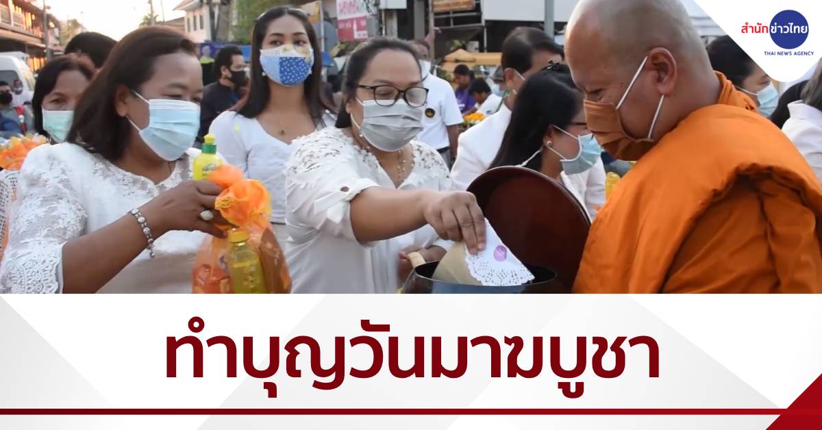 พุทธศาสนิกชนร่วมทำบุญตักบาตรเนื่องในวันมาฆบูชา โดยที่วัดพระมหาธาตุวรมหาวิหาร อ.เมือง จ.นครศรีธรรมราช ผู้ว่าราชการจังหวัด พร้อมส่วนราชการ และพุทธศาสนิกชนจำนวนมาก ร่วมกันทำบุญตักบาตรข้าวสารอาหารแห้งแด่พระสงฆ์ จำนวน 50 รูป เพื่อถวายเป็นพุทธบูชาและความเป็นสิริมงคล ภายใต้มาตรการป้องกันการแพร่ระบาดของโรคโควิด-19 อย่างเข้มงวด และร่วมสืบสานประเพณีแห่ผ้าขึ้นธาตุในงานประเพณีมาฆบูชา