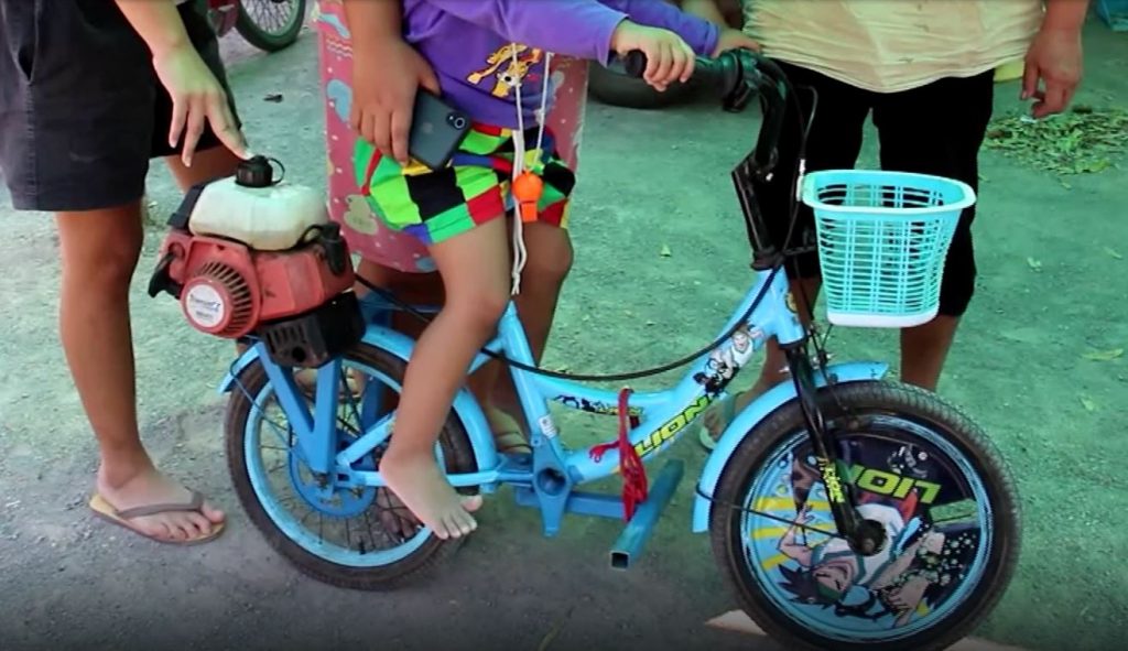 ราชบุรี 26 ก.พ.-ขำกันทั้งซอย ได้ยินเสียงครั้งแรก ใครก็คิดว่าเป็นเครื่องตัดหญ้า ดูอีกทีเป็นเสียงรถจักรยาน ที่ประดิษฐ์ขึ้นโดยใช้เครื่องตัดหญ้า ทำให้รถจักรยานเด็กวิ่งได้เหมือนรถมอเตอร์ไซค์