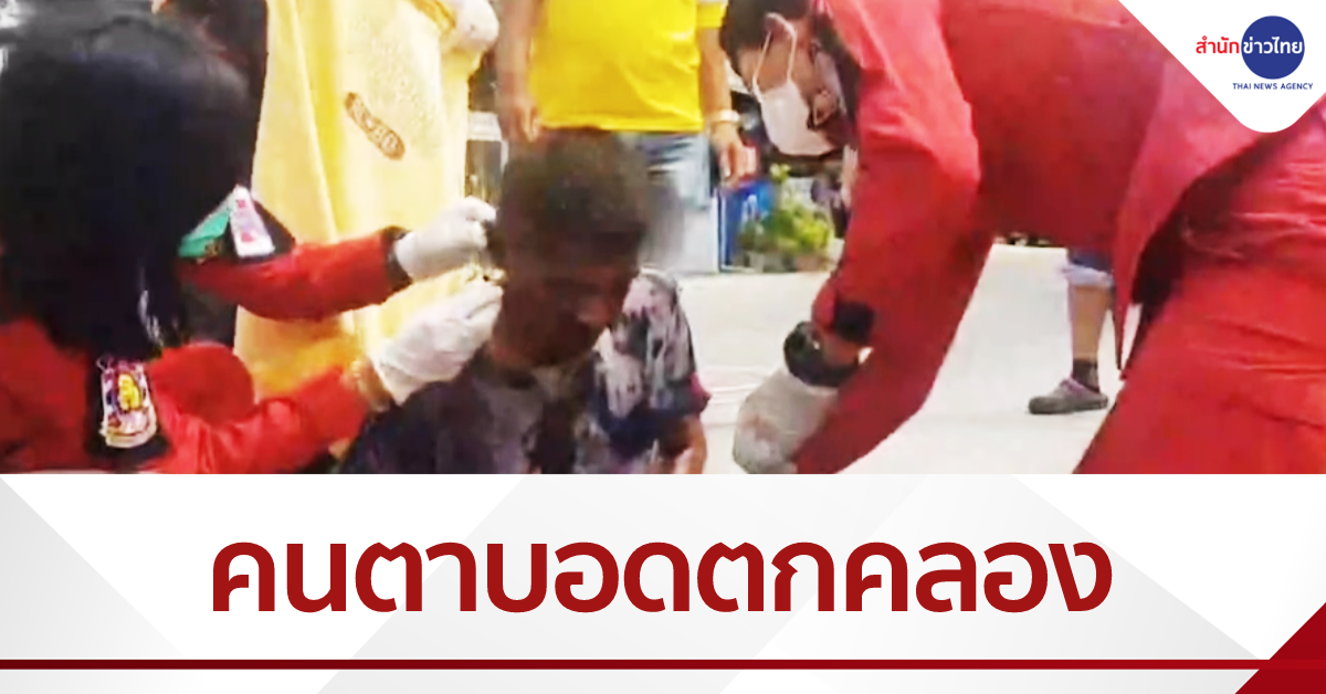 ภาพขณะเจ้าหน้าที่กู้ภัยมูลนิธิธรรมรัศมีมณีรัตน์ เร่งช่วยเหลือนำนายพิทักษ์ แซ่ลือ อายุ 50 ปี ชายตาบอดทั้ง 2 ข้าง ขึ้นจากคลองภายในซอยมาลัยทอง ช่วงหน้าศาลเจ้าแม่มาลัยทอง หมู่ 7 ตำบลบ้านสวน อำเภอเมือง จังหวัดชลบุรี มีบาดแผลแตกที่ศีรษะ กู้ภัยฯปฐมพยาบาลเบื้องต้นรีบนำส่ง รพ.ชลบุรี