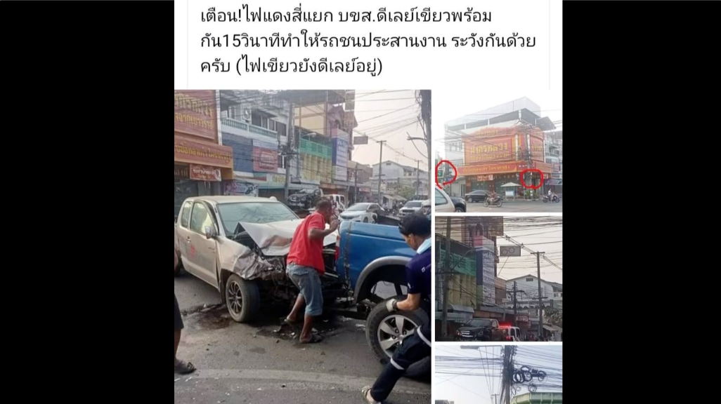 ผู้ใช้เฟซบุ๊กรายหนึ่งโพส์ตคลิปและภาพนิ่ง ขณะเกิดอุบัติเหตุรถยนต์ชนกันบริเวณสี่แยกไฟแดงซึ่งเกิดขึ้นถึง 2 วันซ้อน พร้อมระบุข้อความว่า “เตือนไฟแดง สี่แยก บขส.ดีเลย์เขียวพร้อมกัน 15 วินาที ทำให้รถชนประสานงา ระวังด้วยนะครับ”