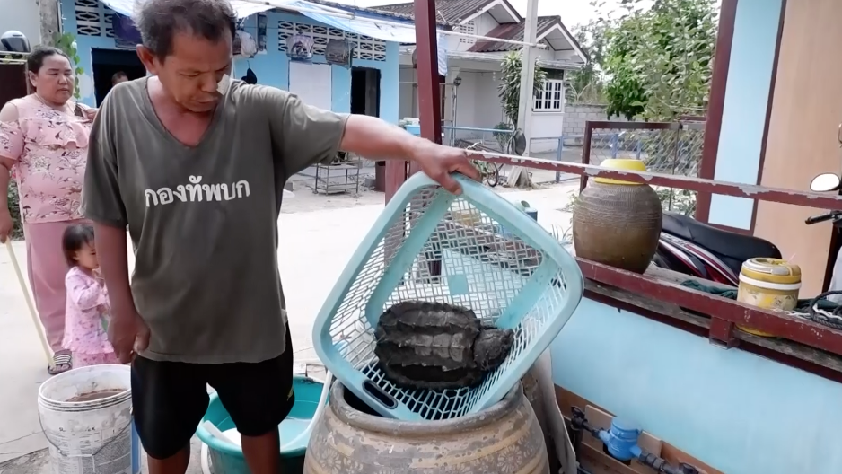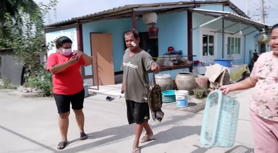 นายสัญญา ยังเล่าให้ฟังว่า ออกไปกู้ลอบปลาที่วางไว้ในแม่น้ำปราณบุรีที่ท่าน้ำคลองหลวง เป็นท่าน้ำที่มีชาวบ้านและเด็กๆ ชอบมาลงเล่นน้ำกันมาก อยู่ห่างจากบ้านไม่ถึง 500 เมตร ระหว่างที่กำลังกู้ลอบขึ้น รู้สึกว่าหนักๆ เมื่อยกลอบขึ้นมาเหนือผิวน้ำก็เจอเต่าหน้าแปลกประหลาดตัวใหญ่ จึงรีบจับใส่นำกลับมาไว้ที่บ้านขังไว้ในโอ่ง ในระหว่างนั้นก็เดินไปบอกน้องสาวว่าเจอเต่าแปลกไม่เคยเจอติดลอบมาได้หนึ่งตัวหน้าแปลก ไม่รู้จะทำอย่างไง จะนำไปปล่อยดีไหม และมีเพื่อนบ้านจะขอไปเลี้ยงตนก็ยังไม่ให้ จึงประสานประมงอำเภอเพื่อให้เจ้าหน้าที่นำไปดูแล อย่าปล่อยลงไปในแหล่งน้ำธรรมชาติเด็ดขาด