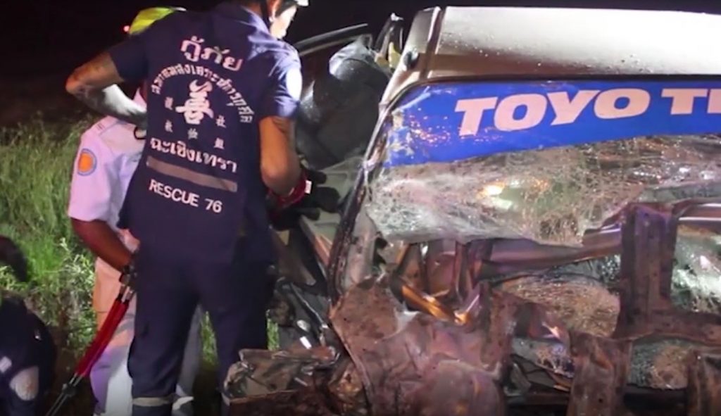 ภาพจากกล้องหน้ารถของประชาชนที่สัญจรผ่านถนนหน้าวัดสุวรรณเตมีย์ พื้นที่ ม.11 ต ดอนฉิมพลี อ.บางน้ำเปรี้ยว จ.ฉะเชิงเทรา บันทึกภาพเหตุการณ์ ขณะที่รถยนต์เก๋งพยายาม แซงขวาตามรถยนต์คันหน้า แต่แซงไม่พ้น ทำให้ชนประสานงาเขากับรถยนต์กระบะส่งของของบริษัทเอกชน โดยเหตุการณ์นี้ผู้ขับขี่รถยนต์เก๋งเสียชีวิตทันทีในที่เกิดเหตุ เหตุเกิดเวลาประมาณ 22.30 น. เมื่อคืนที่ผ่านมา (5 มี.ค.)