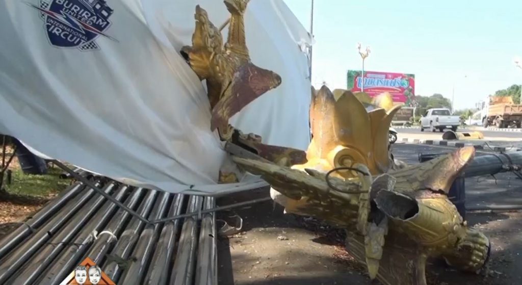 จุดเกิดเหตุบริเวณวงเวียนอนุสาวรีย์รัชกาลที่ 1 อ.เมือง จ.บุรีรัมย์ สภาพเสาโคมไฟรูปหงส์ สูงประมาณ 30 เมตร หักโค่นพังเสียหาย หลังถูกรถยนต์สีขาว ทะเบียน กง-7385 บุรีรัมย์ พุ่งชนและยังไปล้มทับฉัตรที่เตรียมนำมาประดับตกแต่งข้างอนุสาวรีย์รัชกาลที่ 1 ได้รับความเสียหายอีก 7 วงด้วย ส่วนรถที่ชนพังยับ กระโปรงด้านหน้ารถยุบตามรูปเสาไฟ