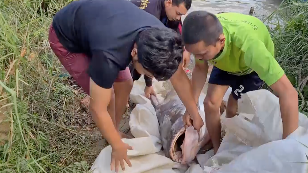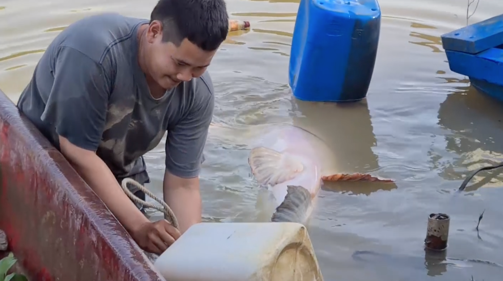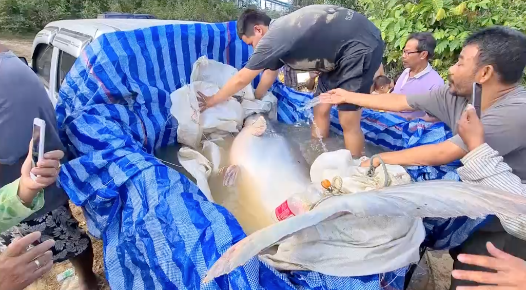 สงขลา 8 มี.ค.- ฮือฮา!! หนุ่มจับปลาบึกยักษ์หนัก 150 กิโลกรัมได้ในคลองอู่ตะเภา ชาวบ้านต่างบอกเป็นเสียงเดียวกันว่าตัวนี้ใหญ่สุดเท่าที่เคยจับได้