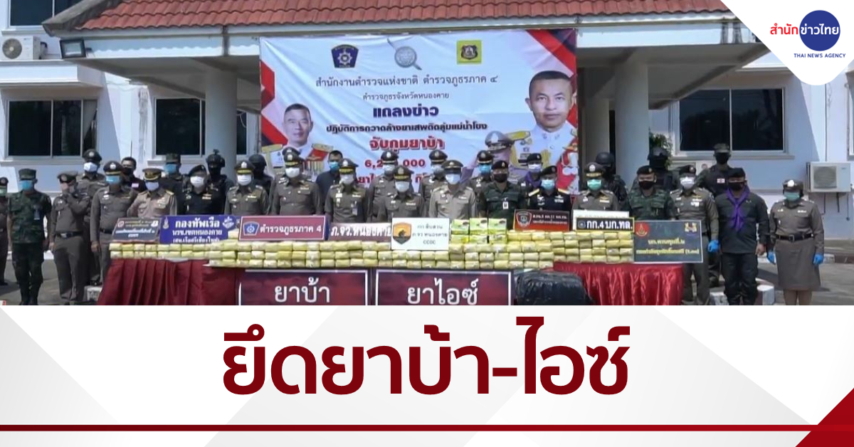 ตำรวจชุดสืบสวนภูธรจังหวัดหนองคาย โชว์ผลงานจับยาบ้า 6.2 ล้านเม็ด ไอซ์ 12 กก. พร้อมผู้ต้องหา 2 คน ริมฝั่งแม่น้ำโขง รวมมูลค่ากว่า 320 ล้านบาท การจับกุมครั้งนี้เจ้าหน้าที่ได้รับแจ้งจากสายลับว่าจะมีการลักลอบนำยาเสพติดเข้ามาในประเทศ บริเวณริมฝั่งโขงบ้านกองนาง ต.กองนาง อ.ท่าบ่อ จ.หนองคาย จึงสนธิกำลังเข้าตรวจสอบ กระทั่งเวลาเที่ยงคืน วันที่ 7 มี.ค. พบรถกระบะขับเข้ามาจอดริมฝั่งโขง เจ้าหน้าที่จึงแสดงตัวเข้าจับกุม พบมีชาย 2 คน อยู่ในรถ เจ้าหน้าที่จับกุมได้ 1 คน อีกคนวิ่งหลบหนีไปได้