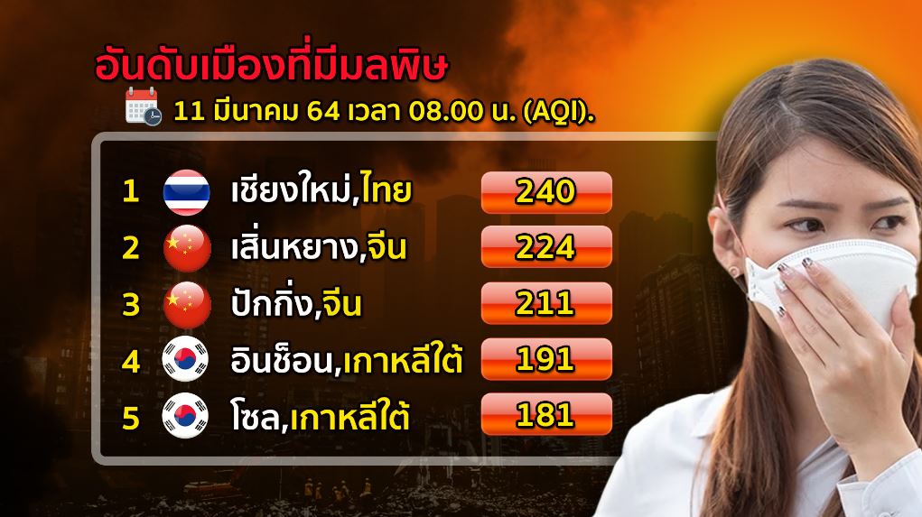 เชียงใหม่ 11 มี.ค.- หมอกควันไฟป่าที่ปกคลุมภาคเหนือ ทำให้ชาวบ้านในภาคเหนือป่วยแล้วกว่า 2 หมื่นคน ขณะที่วันนี้คุณภาพอากาศยังแย่เป็นอันดับ 1 ของโลกติดต่อกันเป็นวันที่ 6