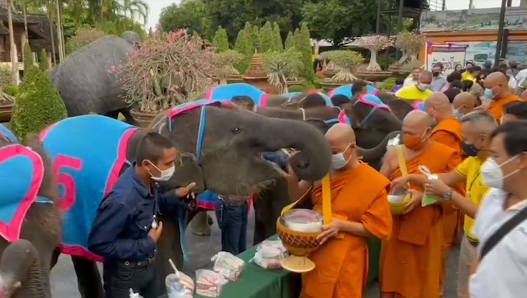 คุณอรสา แต้สัมฤทธิ์ รองผู้อำนวยการสถาบันคชบาลแห่งชาติ ในพระอุปถัมภ์ นายกัมพล ตันสัจจา ประธานสวนนงนุชพัทยา จ.ชลบุรี พร้อมคณะผู้บริหาร พนักงานได้ นำช้างแสนรู้ 35 เชือก ร่วมประกอบพิธีตักบาตรพระสงฆ์ 9 รูป จากวัดสามัคคีบรรพต โดยมีพระครูเกษมกิตติโสภณ (อาจารย์จ่อย) เจ้าอาวาส เป็นประธานฝ่ายสงฆ์ พร้อมประพรมน้ำพระพุทธมนต์ให้โขลงช้างเพื่อความเป็นสิริมงคลเนื่องในวันช้างไทย ประจำปี 2564