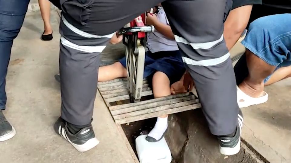 ชลบุรี 16 มี.ค.- เจ้าหน้าที่กู้ภัยสว่างประทีปธรรมสถานศรีราชาใช้อุปกรณ์ตัดถ่างช่วยเด็กหญิงวัย 8 ขวบ ขาติดตะแกรงปิดท่อระบายน้ำภายในโรงเรียน หลังพลาดเดินตกลงไปเป็นแผลถลอก