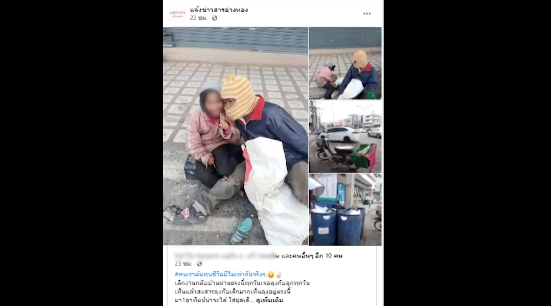 หลังเพจ “แจ้งข่าวสารอ่างทอง” นำโพสต์ของผู้ใช้ชื่อว่า KarTib Kanjanag เป็นภาพชายสูอายุคนหนึ่งที่ต้องนำลูกสาววัย 7 ขวบ ออกเก็บของเก่าบริเวณตลาดอ่างทองในช่วงเย็นของทุกวัน พร้อมระบุข้อความ #คนเราต้นทุนชีวิตมีไม่เท่ากันจริงๆ เลิกงานกลับบ้านผ่านตรงนี้ทุกวันเจอลุงกับลูกทุกวัน เห็นแล้วสงสารลุงกับเด็กมากเห็นลุงอยู่ตรงนี้ มา 1อาทิตย์น่าจะได้ ใส่ชุดเดิมทุกวัน วันนี้เลยแวะเข้าไปหาลุง และได้พูดคุยกัน ลุงบอกว่าที่ต้องมาเก็บขวดขายเพราะอยากหาเงิน ไปซื้อรถ 3 ล้อแดง มันคือ “ซาเล้ง” นั่นแหละ ลุงบอกว่าอยากให้ลูกได้นั่งสบาย อยากได้รถเอาไว้เก็บของจะได้ใส่ของได้เยอะๆ #ที่น่าเศร้าที่สุดลุงบอกว่าลุงเป็นเป็นมะเร็งระยะแรก เป็นได้5-6เดือนแล้ว ทำได้แค่ไปโรงพยาบาลเอายามากินไม่ได้ไปรักษาโดยตรงเพราะไม่มีเงิน ยิ่งได้ฟังเรื่องราวของลุงยิ่งหดหู่ ลุงอายุ 52 ปี ส่วนเด็กผู้หญิง คือลูกสาว เรียนอยู่ชั้น ป.1 ส่วนแม่เด็กเลิกกันไปแล้ว เราขอเป็นสะพานบุญให้ทุกคนที่เห็นโพสต์นี้ ไม่ว่าจะบริจาคเป็นเงิน ของใช้ข้าวสาร อาหารแห้ง ซึ่งมีผู้เข้าไปแสดงความคิดเห็น และช่วยเหลือพ่อลูกคู่นี้จำนวนมาก