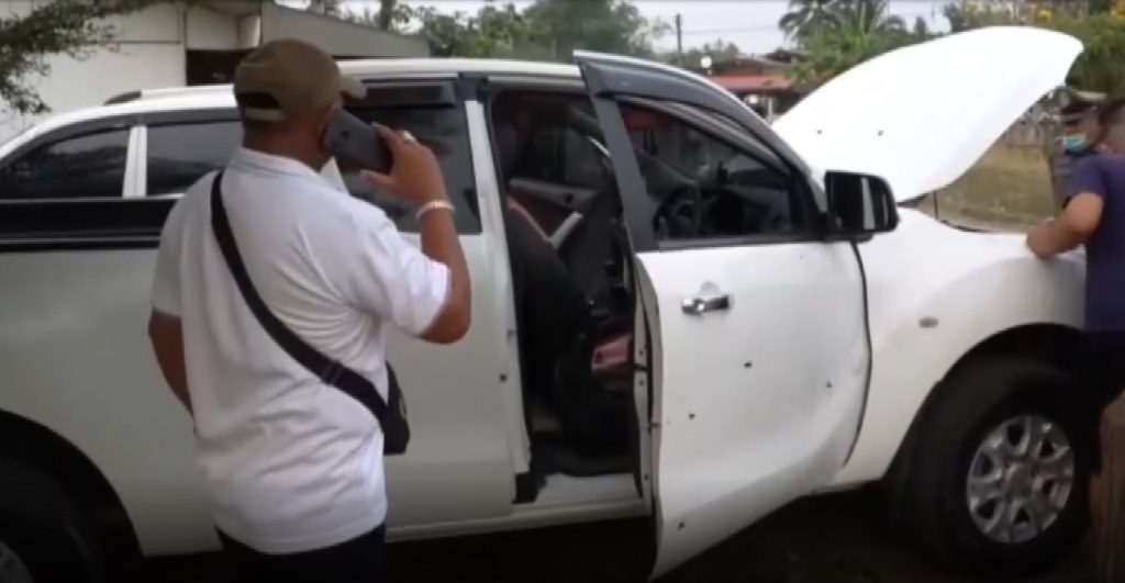 ที่เกิดเหตุเป็นถนนทางขึ้นวัดเขาอังคาร พบรถยนต์กระบะแคป ยี่ห้อมาสด้า สีขาว ทะเบียน บม-1786 บุรีรัมย์ จอดอยู่หน้าบ้านของชาวบ้านเนื่องจากได้ขับไปขอความช่วยเหลือจากชาวบ้าน ซึ่งจากการตรวจสอบพบรอยกระสุนคาดว่าน่าจะเป็นกระสุนขนาด 9 มม. หรือ 11 มม. ทะลุประตูด้านข้างคนขับ 6 รู กระจกหน้าด้านขวา 1 รู ไฟหน้าขวา 1 รู และหัวกระสุนตกในรถนับรวมได้ 12 หัว และจากการตรวจสอบบริเวณถนนจุดเกิดเหตุ พบปลอกกระสุนรวมประมาณ 15 ปลอก จึงเก็บไว้เป็นหลักฐาน