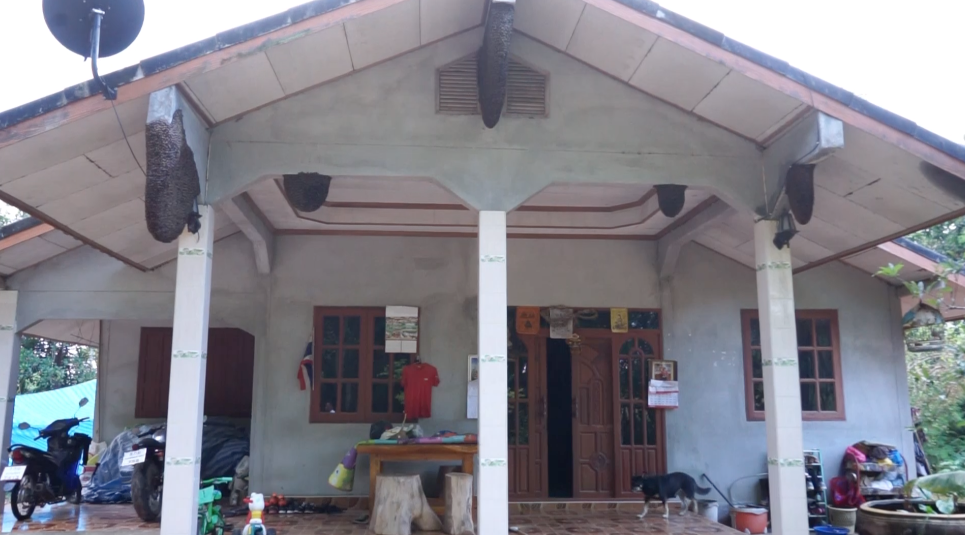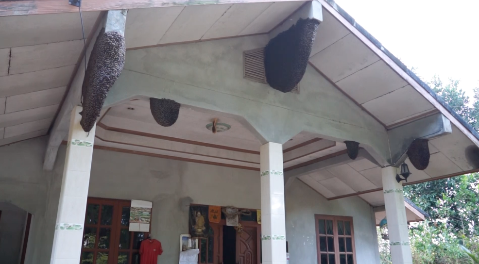 ที่บ้านนางสาวสุภาวดี มุสิกลักษ์ อายุ 29 ปี เลขที่ 106/3 หมู่ 9 บ้านสามหนุ่ม ตำบลบ้านทำเนียบ อำเภอคีรีรัฐนิคม จังหวัดสุราษฎร์ธานี ครอบครัวใหญ่อาศัยอยู่ด้วยกัน 8 คน มีผู้ใหญ่ 5 คนมีเด็กเล็ก 3 คน เจ้าของบ้านเล่าว่า ช่วงกลางเดือนตุลาคมปีที่แล้ว เมื่อนายสงบผู้เป็นพ่อกลับมาจากสวนยางมาถึงบ้านก็ตกใจ พบฝูงผึ้งหลวงขนาดใหญ่บินวนเวียนอยู่หน้าบ้าน จึงเรียกแม่ที่ทำกับข้าวอยู่ในครัวออกมาดู แต่แปลกฝูงผึ้งที่บินอยู่ไม่ได้ทำร้ายใคร ต่อมาฝูงผึ้งได้บินขึ้นไปทำรังข้างหลอดไฟ ตอนนั้นเกรงว่าฝูงผึ้งจะทำร้ายเด็กๆ จึงใช้สเปรย์ฆ่ายุงฉีดไล่แต่ฝูงผึ้งไม่ไปไหน มีส่วนหนึ่งบินออกจากบ้านไป แต่ไม่นานก็กลับมาพร้อมฝูงผึ้งจำนวนมากขึ้นกว่าเดิม และมาทำรังที่ตรงกลางหน้าบ้านและด้านข้างเพิ่มขึ้นอีก 2 รัง