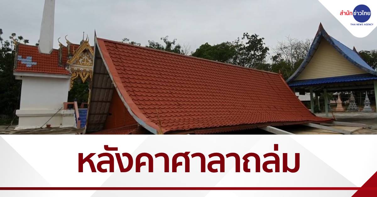 นครราชสีมา 23 มี.ค.-พายุฤดูร้อนพัดถล่มศาลาพักศพ วัดห้วยม่วง อ.บัวลาย จ.นครราชสีมา พังเสียหาย ขณะที่ฝาผนังห้องเรียนโรงเรียนบ้านห้วยม่วงปลิวปะทะโต๊ะเก้าอี้ เสียหายระเนระนาด