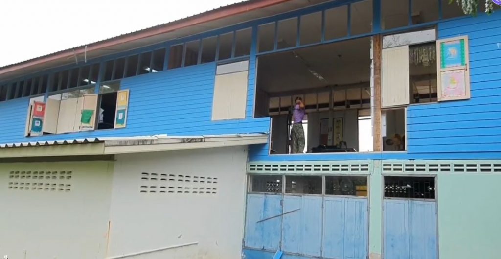 เช่นเดียวกับที่โรงเรียนบ้านห้วยม่วง ซึ่งอยู่ติดกันก็ได้รับผลกระทบจากพายุฤดูร้อน ทำให้อาคารเรียน 2 ชั้น โดยเฉพาะห้องเรียนชั้น ป.1 ฝาหนังห้องและหน้าต่างพังทะลุ แผงไม้กระดานปลิวเข้ามาในห้องเรียนชนปะทะกับโต๊ะเก้าอี้ หนังสือ สื่อการเรียนการสอน พังเสียหายระเนระนาด โชคดีเหตุเกิดนอกเวลาเรียน จึงไม่มีใครได้รับบาดเจ็บ