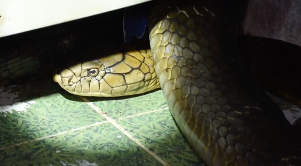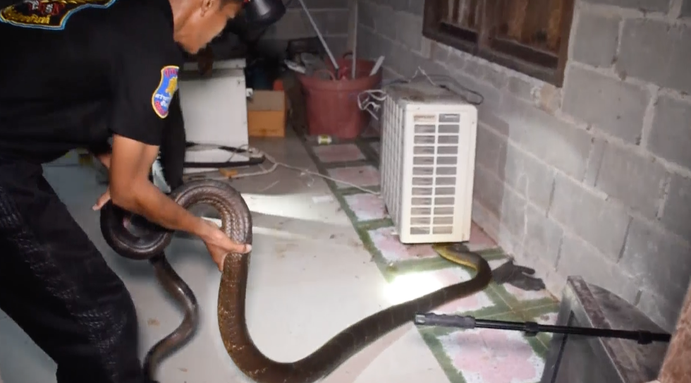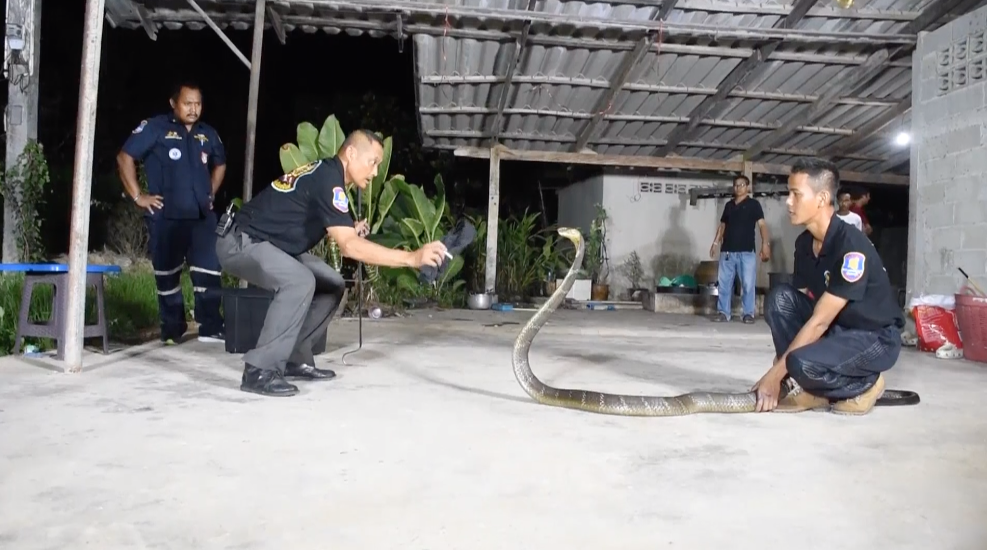 ต่อมา สิบเอกณัฐพล พร้อมทีมงานได้ช่วยกันยกสิ่งของออกมาจากห้องอย่างระมัดระวัง ทันทีที่ห้องโล่งขึ้น ได้พบงูจงอางตัวแรก ลำตัวขนาดใหญ่สีทอง เลื้อยเข้าไปหลบอยู่ในซอกคอมเพรสเซอร์แอร์ แต่ด้วยสภาพพื้นที่เป็นที่แคบยากต่อการใช้อุปกรณ์จับ และยังต้องระวังงูจงอางอีกตัวทาง สิบเอกณัฐพล ตัดสินใจใช้ตะขอเกี่ยวที่ลำตัว และใช้มือเปล่าดึงส่วนหางค่อยๆ ดึงงูจงอางออกมาอย่างระมัดระวัง ก่อนจะนำตัวออกไปในที่โล่งเพื่อง่ายต่อการควบคุม งูจงอางตัวดังกล่าวมีความยาวประมาณ 4 เมตร เป็นงูป่าธรรมชาติ สังเกตจากพฤติกรรมชูคอแผ่แม่เบี้ย ข่มขู่ตอบโต้เมื่อถูกรุกราน จากนั้นทางทีมงานได้ใช้วิธีนำกล่องพลาสติกมาหลอกล่อ เพื่อให้งูเลื้อยเข้าไปหลบตามสัญชาตญาณ