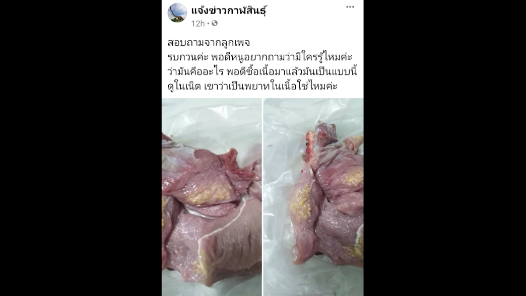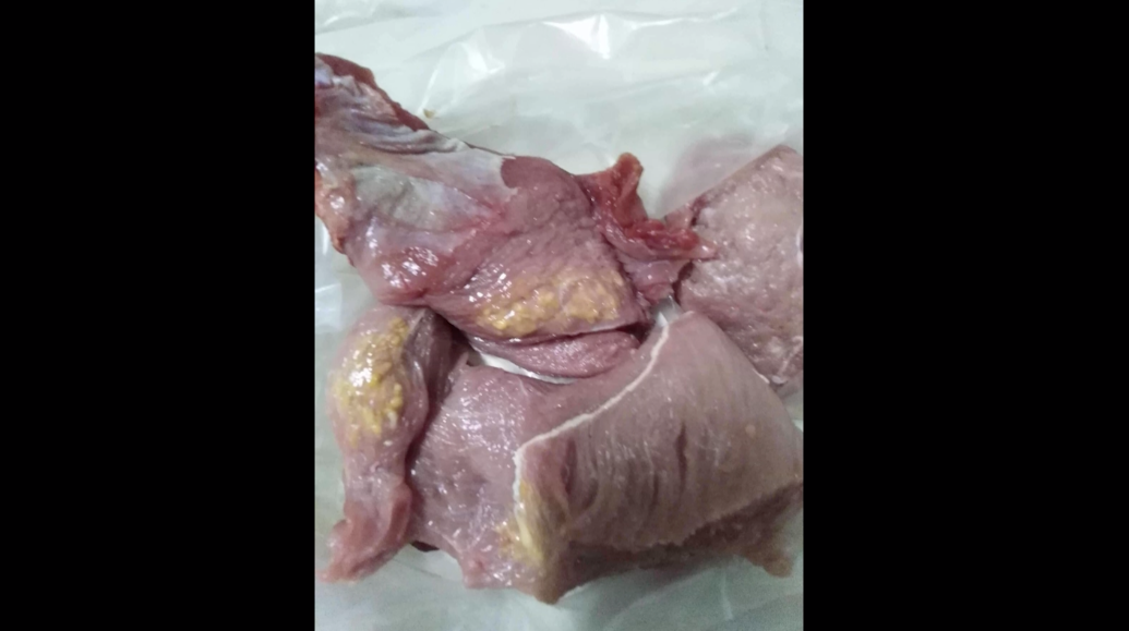 ผู้ช่วยศาสตราจารย์ณัธคพัชฬ รัตนพิทูลย์ อาจารย์ศูนย์วิจัยโรคปรสิต สำนักวิชาแพทยศาสตร์ มหาวิทยาลัยเทคโนโลยีสุรนารี กล่าวว่าได้รับภาพเนื้อสันคอหมูซึ่งมีผู้ส่งมาโดยซื้อมาจากตลาด พอหั่นแล้วพบก้อนสีเหลือง ลักษณะเหมือนก้อนหนอง พร้อมสอบถามว่าเกิดจากอะไรและกินได้หรือไม่ เมื่อเปรียบเทียบกับเนื้อหมูที่มีตัวอ่อนพยาธิตืดหมูซึ่งมีถุงคล้ายเม็ดสาคูสีขาวแทรกอยู่ตามเนื้อพบว่า แตกต่างกันอย่างชัดเจน จึงคาดว่าเป็นการอักเสบจากภาวะติดเชื้อ