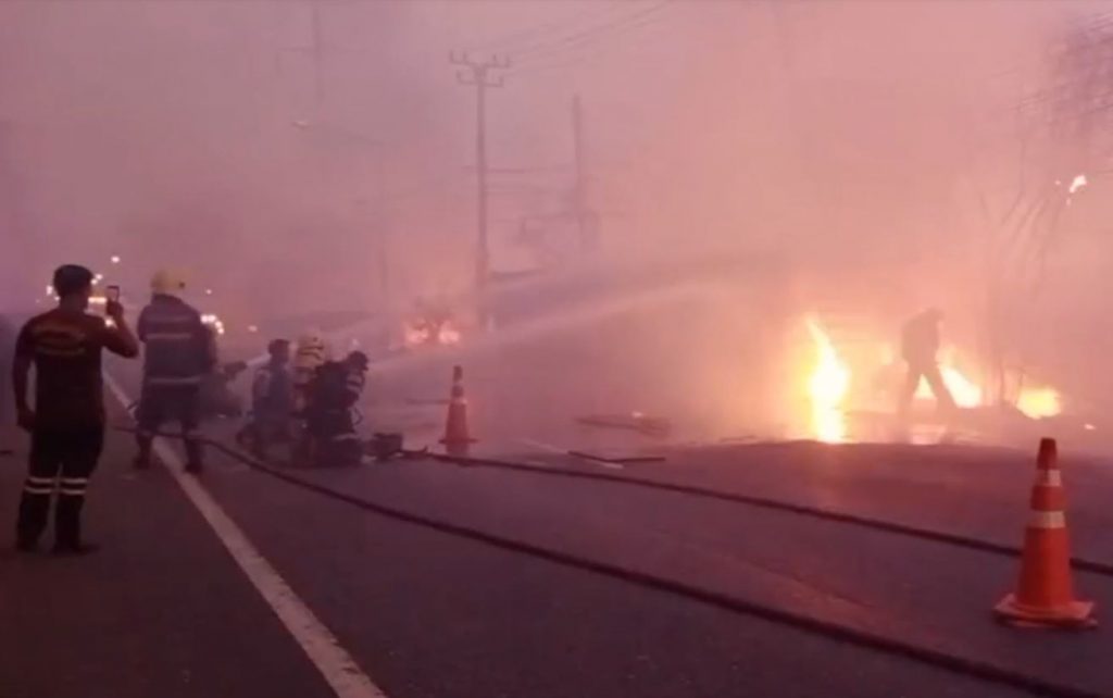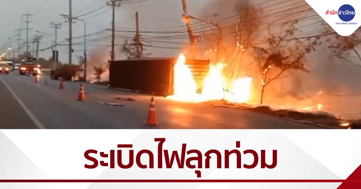 สมุทรปราการ 25 มี.ค.- ระทึก! รถพ่วงทำตู้คอนเทนเนอร์บรรจุถังสีทินเนอร์จำนวนมาก ตกกลางถนนบางนา-ตราด เกิดระเบิดไฟลุกท่วม เจ้าหน้าที่ดับเพลิง-นักข่าว บาดเจ็บรวม 4 คน