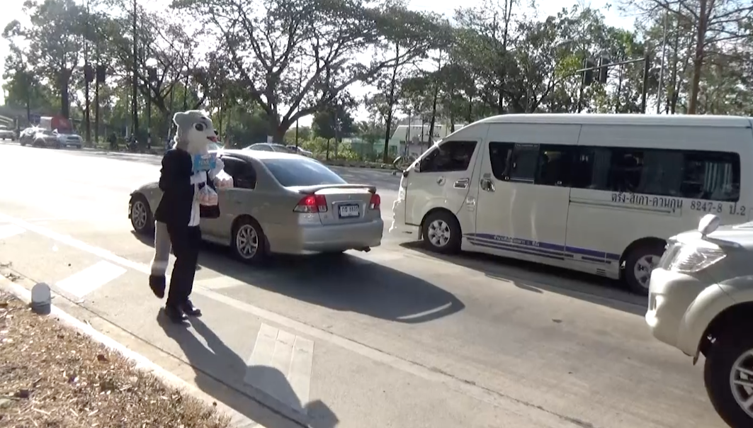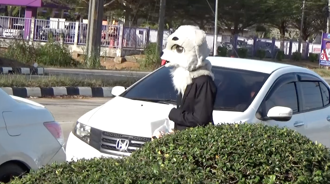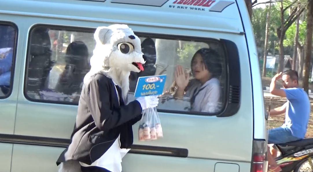 ซึ่งระหว่างที่ขายก็ไม่เคยถอดมาสคอตออกมาให้ลูกค้าเห็นหน้า เพราะเป็นคนขี้อาย และมักจะเรียกรอยยิ้มให้กับชาวบ้านด้วยการโบกไม้โบกมือ ยกมือสวัสดี ทักทายกับเด็กๆ และคอยโบกรถให้เพื่อลดความเครียดหลังผู้คนเหน็ดเหนื่อยจากการทำงานมาตลอดทั้งวัน จึงนับเป็นตัวอย่างที่ดีที่เยาวชนรุ่นใหม่ควรจะเอาเป็นแบบอย่าง.-สำนักข่าวไทย