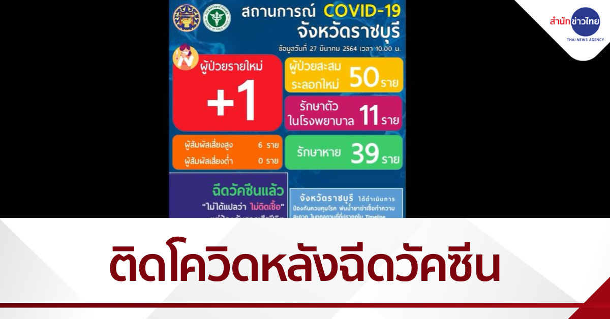 ราชบุรี 27 มี.ค. – จ.ราชบุรี พบหญิงวัย 29 ปี อาชีพขายอาหารทะเลในตลาดกิตติ บางแค กรุงเทพฯ ติดโควิด-19 ตรวจพบเชื้อหลังฉีดวัคซีนป้องกันโควิด-19 เข็มที่ 1