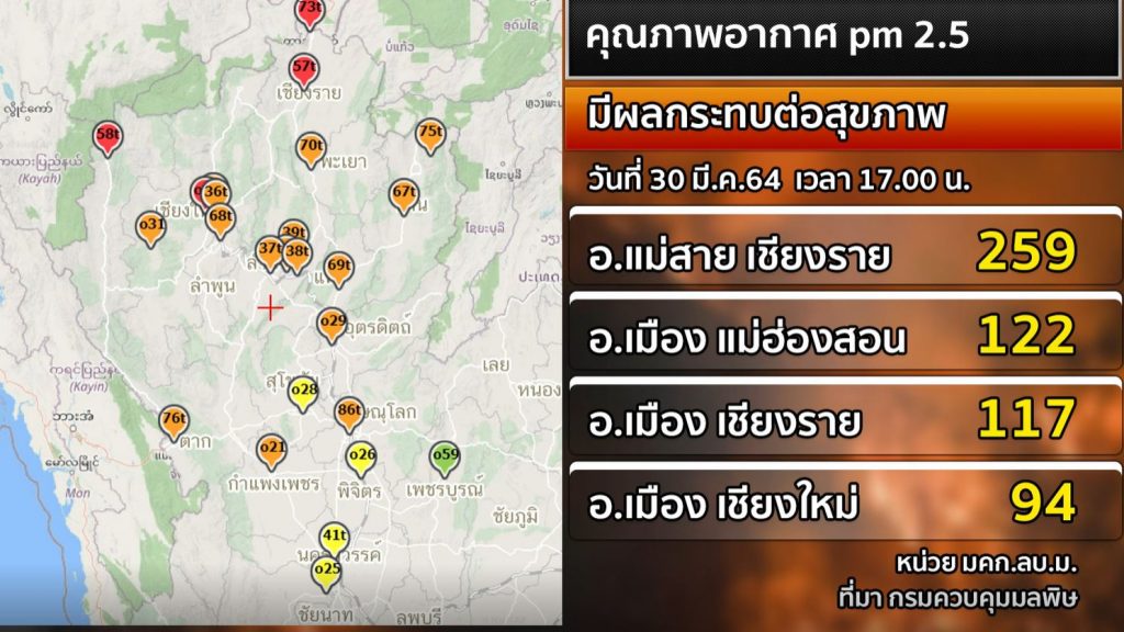 ข้อมูลจากศูนย์ข้อมูลการเปลี่ยนแปลงสภาพภูมิอากาศ มหาวิทยาลัยเชียงใหม่รายงานค่า PM 2.5 บริเวณบ้านหัวโท อ.เชียงดาว สูงถึง 415 ไมโครกรัม/ลูกบาศก์เมตร สูงถึง 8 เท่า ของค่ามาตรฐาน ที่น้ำพุร้อนสันกำแพง สูง 327 ไมโครกรัม/ลูกบาศก์เมตร พื้นที่โรงเรียนบ้านห้วยจะค่าน อ.เชียงดาว 375 ไมโครกรัม/ลูกบาศก์เมตร ส่วนบริเวณโรงพยาบาลสะเมิง 125 ไมโครกรัม/ลูกบาศก์เมตร และเครื่องตรวจวัดที่ติดตั้งไว้ตามโรงพยาบาลและสถานที่ต่างๆ กว่า 30 แห่ง ค่า PM2.5 สูงเกินจุดวิกฤติทั้งหมด มีผลกระทบต่อสุขภาพประชาชน ด้านเว็บไซต์ Air Visual รายงานจังหวัดเชียงใหม่ มีคุณภาพอากาศแย่ติดอันดับ 3 ของโลก