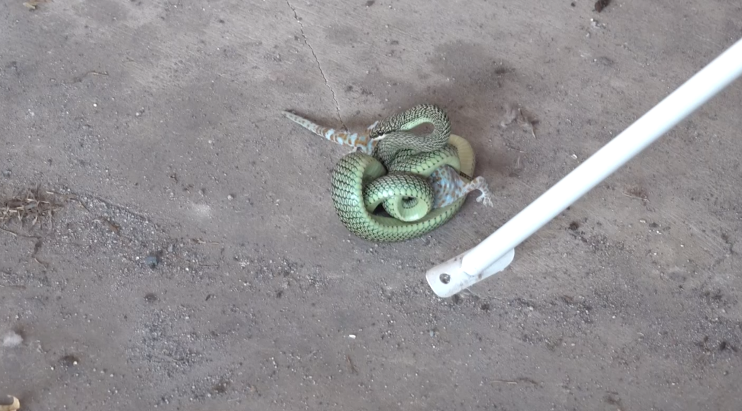ฉะเชิงเทรา 1 เม.ย.- ภาพนาทีเจ้าของบ้านเข้าช่วยตุ๊กแกที่ถูกงูเขียวรัดแล้วร่วงมาจากขื่อหลังคาโรงจอดรถจนแน่นิ่งไป ทีแรกนึกว่างูเขียวจะกินตับ แต่สุดท้ายตุ๊กแกไม่ขยับจึงรีบจับแยก