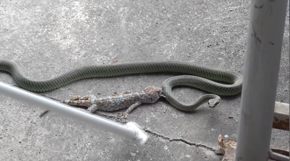 ภาพวงจรปิดภายในโรงจอดรถหอพักเลขที่ 96/1 หมู่ 7 ต.บางวัว อ.บางปะกง จ.ฉะเชิงเทรา จับภาพขณะที่งูเขียวกอดรัดตุ๊กแกจนแน่น ทีแรกเข้าใจว่างูเขียวจะกินตับตุ๊กแก แต่พอเข้าไปดูและเขี่ยดูเห็นว่าตุ๊กแกนั้นแน่นิ่งผิดสังเกตจึงรีบไปหาเหล็กมาเขี่ยแยกทั้งสองตัวออกจากกัน ใช้เวลาประมาณ 5 นาที สุดท้ายพอจับแยกปรากฏว่าตุ๊กแกที่ตายไปแล้วปากยังคงกัดลำตัวงูเขียวอยู่ ทำให้งูเขียวเลื้อยไปต่อไม่ได้ จึงต้องพยายามเขี่ยแยกตุ๊กแกที่กัดอยู่ออก สุดท้ายงูเขียวพยายามเลื้อยหนีแล้วสะบัดตุ๊กแกออกจากตัวจนสำเร็จ เห็นภาพนี้เลยทำให้เชื่อที่บอกกันว่าตุ๊กแกกัดไม่ปล่อยเป็นเช่นนี้นี่เอง.-สำนักข่าวไทย
