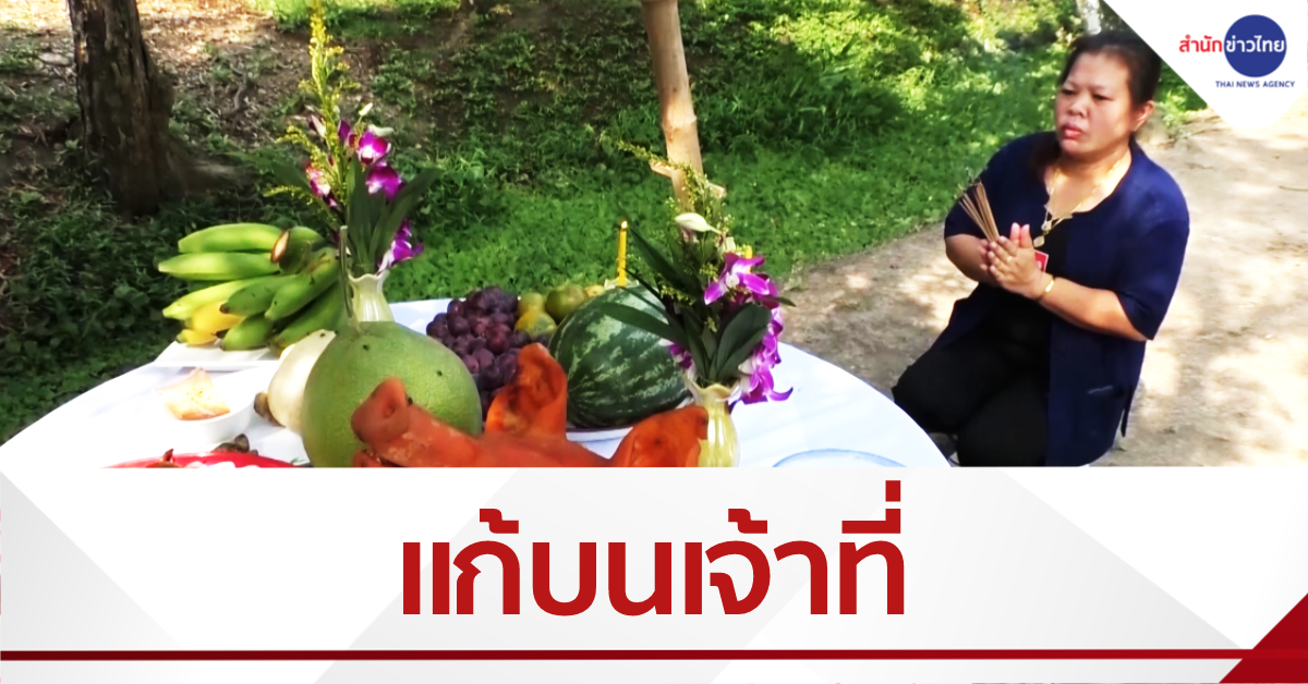 สมุทรสงคราม 1 เม.ย.- สาวชาวสวนลิ้นจี่จัดหัวหมูเป็ดย่างผลไม้ชุดใหญ่พร้อมจุดประทัดรำแก้บนถวายเจ้าที่ หลังลิ้นจี่ต้นแรกที่ให้ผลผลิตในรอบ 3 ปี
