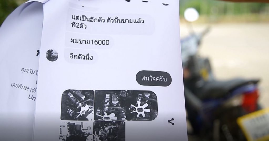 ผู้เสียหายเปิดเผยว่า เครื่องยนต์รถปิกอัพเสีย จึงสั่งซื้อรุ่นนี้กับผู้ใช้เฟซบุ๊กชื่อพงษ์ พันธุ์อะไหล่ ตามข้อมูลอยู่ที่ จ.มหาสารคาม ได้โชว์วิดีโอการทำงานให้ดู ทำให้เชื่อใจ ตกลงสั่งซื้อในราคา 16,000 บาท บวกค่าขนส่ง 1,000 บาท รวมเป็นเงิน 1,7000 บาท และถามย้ำเพื่อความมั่นใจด้วยว่าจะได้รับสินค้าวันไหน คนขายยืนยันคำตอบว่าได้รับสินค้าจริง ไม่ต้องห่วง มีคนสั่งซื้อจำนวนมาก โดยสรุปได้รับแจ้งได้รับเครื่องยนต์ในวันที่ 27 มี.ค. และโชว์ภาพการแพ็ก การเตรียมขนส่ง แต่ปรากฏว่าเมื่อถึงวันกำหนดรับสินค้า ไม่มีสนค้าส่งมาให้ รวมทั้งไม่สามารถติดต่อผู้ใช้เฟซบุ๊กชื่อพงษ์ พันธุ์อะไหล่ ได้อีกต่อไป