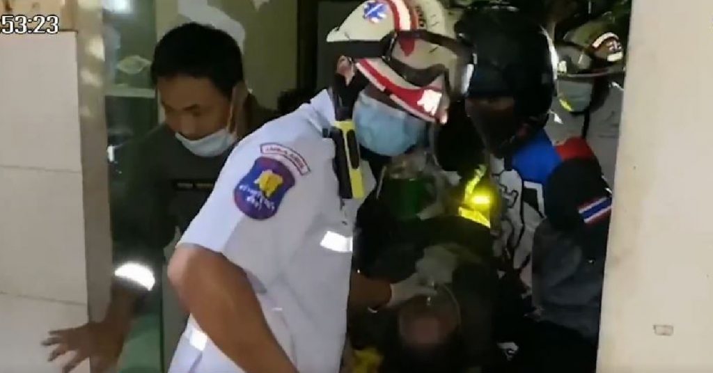 ภาพวินาทีเจ้าหน้าที่ดับเพลิงระดมกำลังช่วยเหลือผู้ป่วยติดเตียงอายุ 66 ปี ที่ติดอยู่ภายในบ้านเลขที่ 79 หมู่ 9 ตำบลหนองปรือ อำเภอบางละมุง จังหวัดชลบุรี ซึ่งประสบเหตุเพลิงไหม้ช่วงกลางดึก จากนั้นได้ลำเลียงผู้ป่วยขึ้นรถฉุกเฉิน และนำส่งโรงพยาบาลเป็นการด่วน