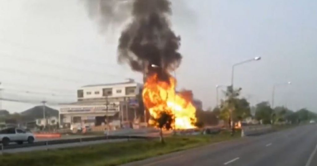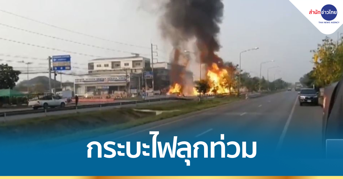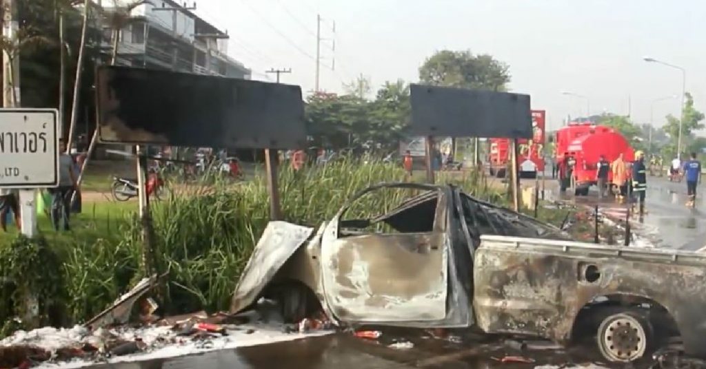 ราชบุรี 6 เม.ย. – รถกระบะบรรทุกสเปรย์ยาฉีดกันยุงเสียหลักพลิกคว่ำ เกิดระเบิดไฟลุกท่วม บนถนนเพชรเกษม ต.บ้านสิงห์ อ.โพธาราม จ.ราชบุรี คนขับเสียชีวิต