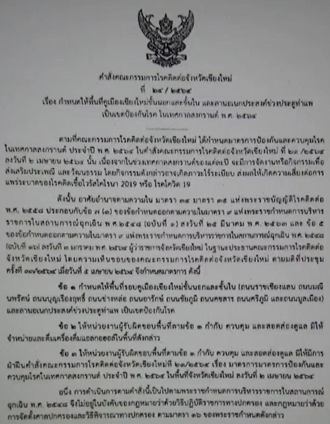 นายเจริญฤทธิ์ สงวนสัตย์ ผู้ว่าฯ เชียงใหม่ ประธานคณะกรรมการโรคติดต่อจังหวัดเชียงใหม่ ออกหนังสือคำสั่งกำหนดให้พื้นที่บริเวณรอบคูเมืองเชียงใหม่ ทั้งด้านในคูเมืองและพื้นที่คูเมืองด้านนอก บริเวณถนนราชเชียงแสน ถนนมณีนพรัตน์ ถนนบุญเรืองฤทธิ์ ถนนช่างหล่อ ถนนอารักษ์ ถนนชัยภูมิ ถนนคชสาร ถนนมูลเมือง รวมทั้งบริเวณพื้นที่ข่วงประตูท่าแพ เป็นเขตป้องกันโรคติดต่อ มีผลตั้งแต่วันที่ 10-20 เมษายน 2564 โดยให้หน่วยงานที่เกี่ยวข้องดูแล ห้ามจำหน่ายและดื่มเครื่องดื่มแอลกอฮอล์ หากฝ่าฝืนจะมีโทษจำคุกไม่เกิน 1 ปี ปรับไม่เกิน 100,000 บาท หรือทั้งจำทั้งปรับ และห้ามมีขบวนแห่ในช่วงเทศกาลสงกรานต์ จัดได้เฉพาะของสำนักงานวัฒนธรรมจังหวัดเชียงใหม่ ต้องจำกัดไม่เกิน 200 คน และเป็นไปตามมาตรการของกระทรวงสาธารณสุข