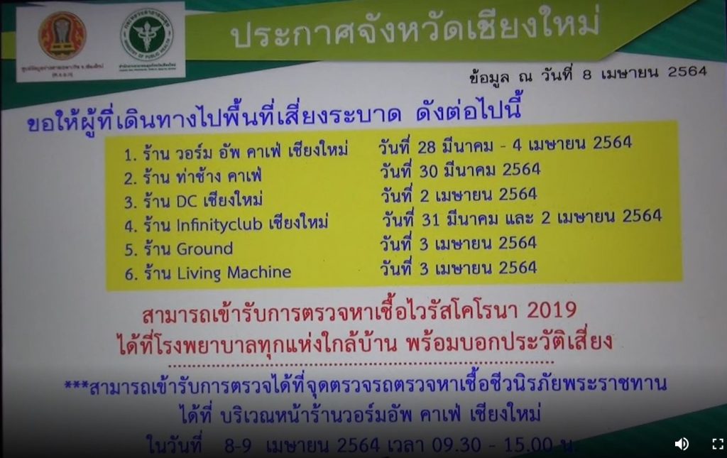 ขณะที่เชียงใหม่ ยอดติดเชื้อวันเดียวพุ่งไปถึง 36 คน สำนักงานสาธารสุขของจังหวัด ต้องประกาศขอให้กลุ่มนักเที่ยวที่เข้าไปใช้บริการสถานบันเทิง 6 แห่งในตัวเมืองเชียงใหม่ ตั้งแต่วันที่ 30 มีนาคม ถึง 4 เมษายน ไปตรวจหาเชื้อโควิดที่ลานหน้าร้านวอร์มอัพเป็นการด่วน.-สำนักข่าวไทย