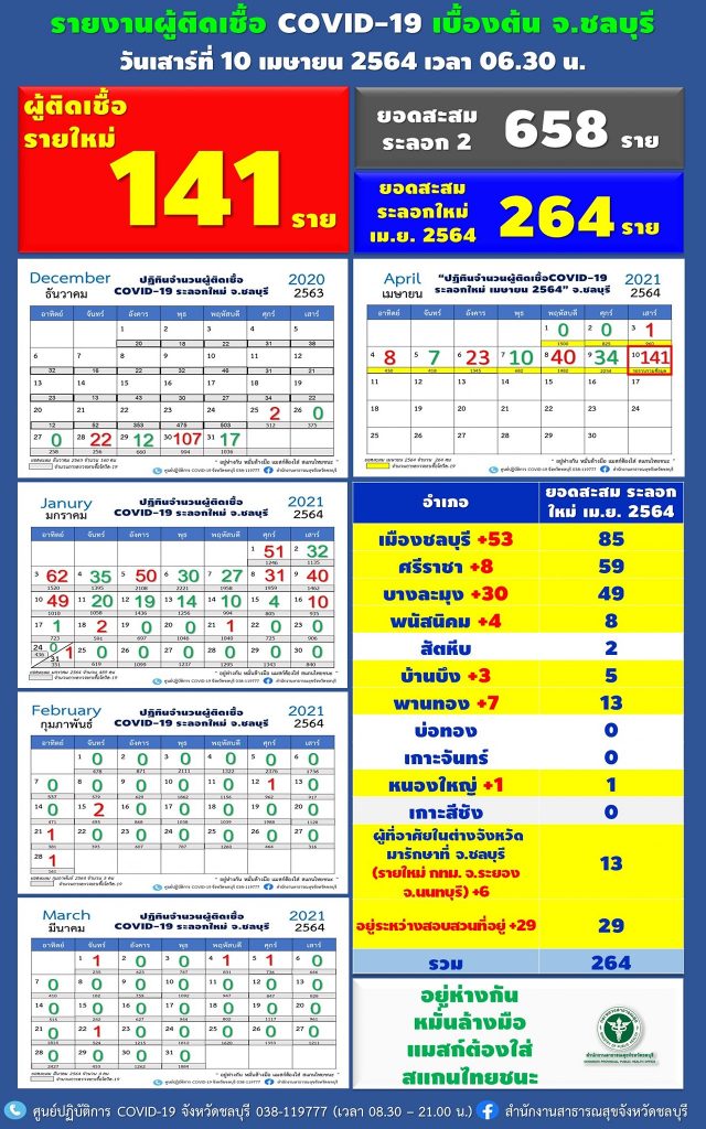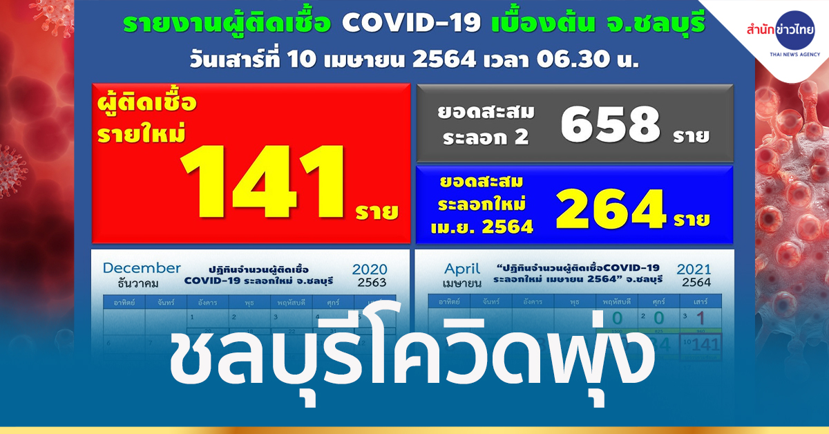 ชลบุรี 10 เม.ย.-สำนักงานประชาสัมพันธ์จังหวัดชลบุรี – Chonburi PR รายงานยอดผู้ป่วยโควิด-19 ยืนยันรายใหม่ วันนี้ 141 ราย เร่งค้นหาเชิงรุก ปิดสถานบันเทิงทุกแห่งอย่างน้อย 14 วัน เพื่อยับยั้งการระบาด