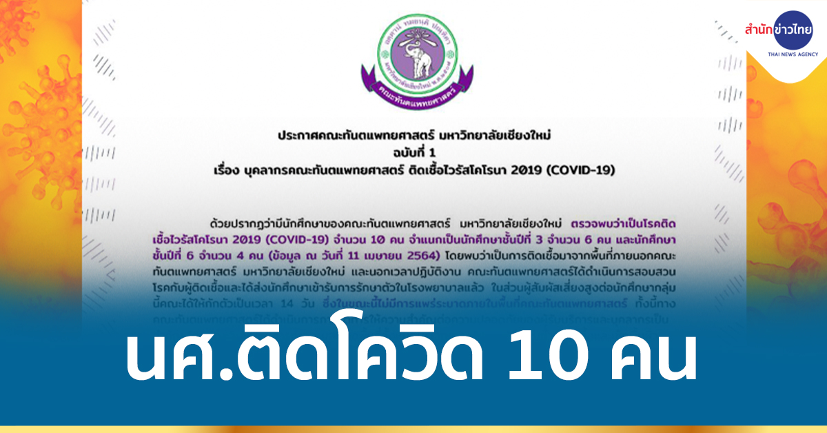 เชียงใหม่ 11 เม.ย.-คณะทันตแพทยศาสตร์ ม.เชียงใหม่ ออกประกาศ นักศึกษาติดโควิด-19 จำนวน 10 ราย เป็นการติดเชื้อจากภายนอกคณะฯ และนอกเวลาปฏิบัติงาน