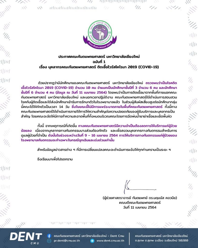 ด้วยปรากฏว่ามีนักศึกษาของคณะทันตแพทยศาสตร์ มหาวิทยาลัยเชียงใหม่ ตรวจพบว่าเป็นโรคติดเชื้อไวรัสโคโรนา 2019 (COVID-19) จำนวน 10 คน (ข้อมูล ณ วันที่ 11 เมษายน 2564) โดยพบว่าเป็นการติดเชื้อมาจากพื้นที่ภายนอกคณะทันตแพทยศาสตร์และนอกเวลาปฏิบัติงาน คณะทันตแพทยศาสตร์ได้ดำเนินการสอบสวนโรคกับผู้ติดเชื้อและได้ส่งนักศึกษาเข้ารับการรักษาตัวในโรงพยาบาลแล้ว ในส่วนผู้สัมผัสเสี่ยงสูงต่อนักศึกษากลุ่มนี้คณะได้ให้กักตัวเป็นเวลา 14 วัน ซึ่งในขณะนี้ไม่มีการแพร่ระบาดภายในพื้นที่คณะทันตแพทยศาสตร์ ทั้งนี้คณะจะจัดให้มีการทำความสะอาดพื้นที่ทั้งหมดบริเวณคณะโดยการฉีดพ่นน้ำยาฆ่าเชื้อและเช็ดพื้นผิวเพื่อความมั่นใจต่อผู้เข้ามารับบริการด้วยมาตรฐานสูงสุด