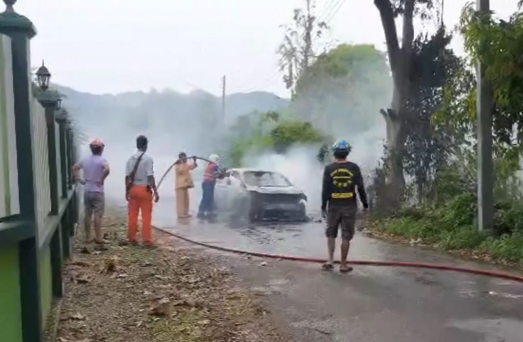 เกิดเหตุไฟลุกไหม้รถยนต์นิสสัน อัลเมร่า สีขาว หมายเลขทะเบียน กท 7033 กาญจนบุรี บนถนนภายในหมู่บ้าน ด้านหลังโรงเรียนบ้านหนองบัว ตำบลหนองบัว อำเภอเมืองกาญจนบุรี ซึ่งเจ้าหน้าที่ดับเพลิงเทศบาลตำบลแก่งเสี้ยนกำลังพยายามใช้น้ำเข้าฉีดควบคุมเพลิง แต่ไฟได้ลุกไหม้ห้องโดยสารอย่างหนัก ทำให้แม้เจ้าหน้าที่จะรีบฉีดน้ำสกัดได้เร็วขนาดไหน แต่เพลิงก็ลามไหม้รถเสียหายไปทั้งคัน