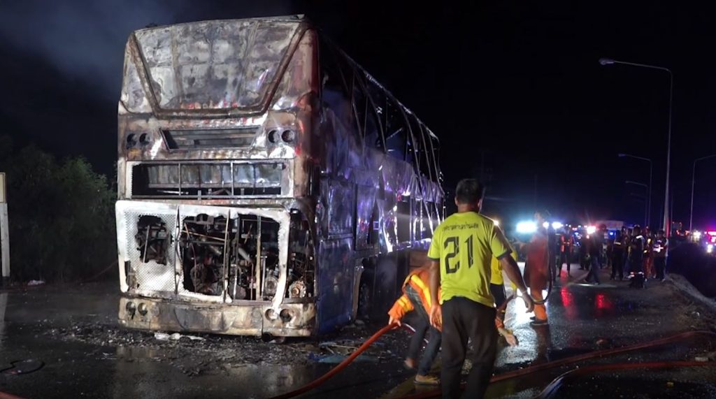 เหตุการณ์เกิดขึ้นเมื่อเวลา 00.25 น. ที่ผ่านมา โดยเจ้าหน้าที่ระดมกำลังฉีดน้ำสกัดไฟที่ลุกไหม้รถทัวร์โดยสาร 2 ชั้น บนถนนมิตรภาพ พื้นที่บ้านหนองขาม ตำบลโนนสมบูรณ์ อำเภอบ้านแฮด จังหวัดขอนแก่น ใช้เวลาประมาณ 30 นาที จึงสามารถควบคุมเพลิงไว้ได้ แต่รถเสียหายทั้งคัน ก่อนเจ้าหน่วยกู้ภัยและหน่วยกู้ชีพใกล้เคียงได้นำผู้บาดเจ็บจำนวนมาก ส่งรักษาตัวที่โรงพยาบาลสิรินธรและโรงพยาบาลขอนแก่น