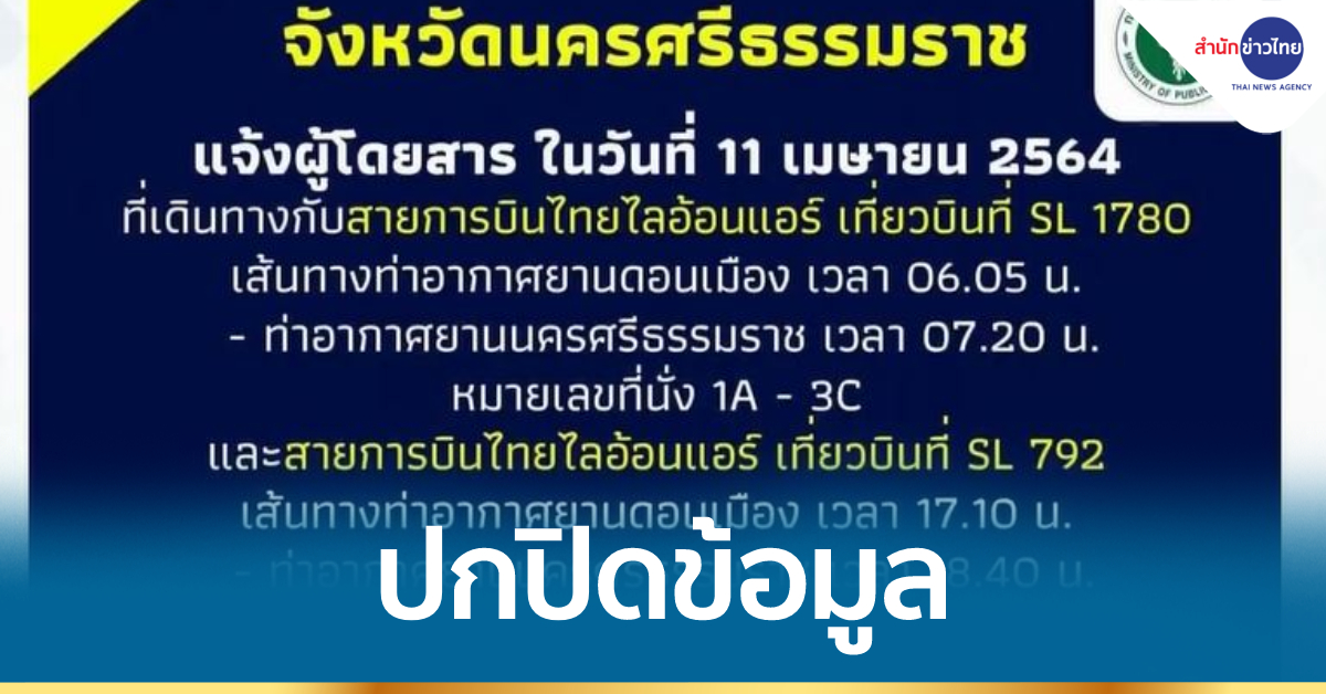 นครศรีธรรมราช 13 เม.ย. – ผู้ป่วยโควิด 2 คน เป็นคู่รักกัน มีพฤติกรรมปกปิดข้อมูล โดยสารเครื่องบินหนีจากกรุงเทพฯ กลับนครศรีธรรมราช ทางจังหวัดเร่งติดตามกลุ่มเสี่ยงเข้าตรวจหาเชื้อ