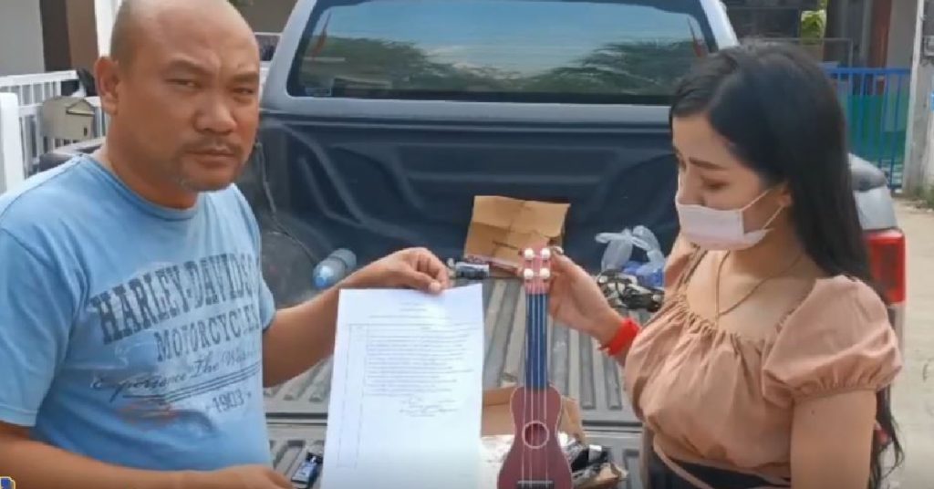 หลังจากนั้นมีเจ้าหน้าที่มาส่งสินค้าก็จ่ายเงินไป ก่อนแกะกล่องดู ปรากฏว่าสินค้าไม่ตรงปก เป็นกีตาร์พลาสติกของเล่นเด็ก ราคาประมาณ 20 บาท หลังเห็นสินค้าคิดว่าถูกหลอกอย่างแน่นอน ซึ่งตั้งใจจะนำมาเล่นอยู่ที่บ้านในช่วงที่โรคโควิด-19 ระบาด