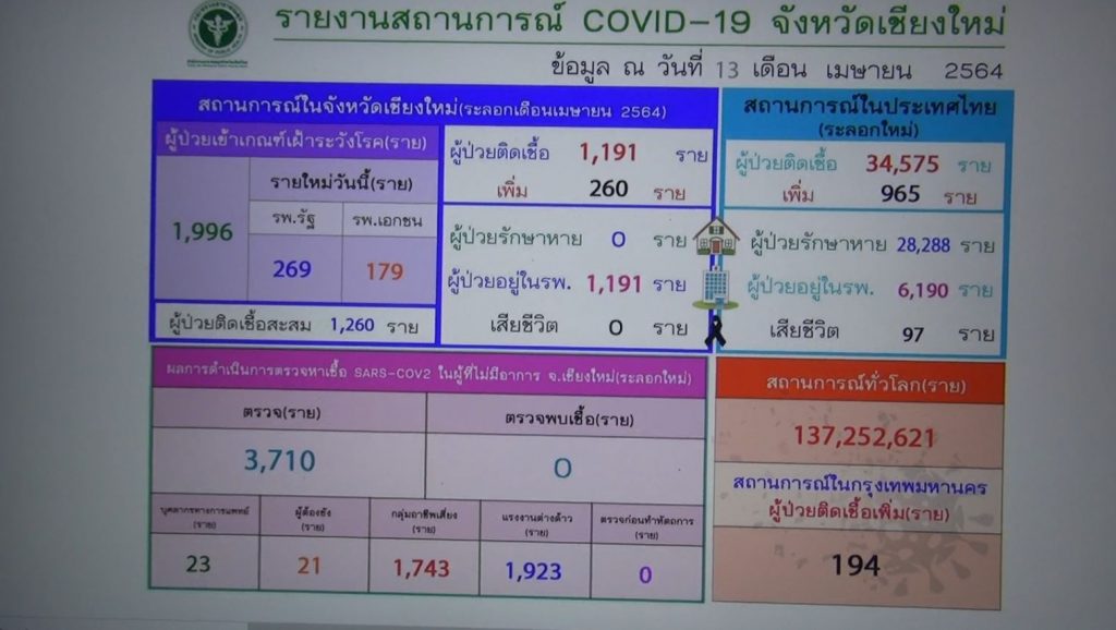 ขณะที่เชียงใหม่มีจำนวนผู้ป่วยที่นอนรักษาตัวในโรงพยาบาลของรัฐ และโรงพยาบาลสนามมากถึง 1,191 ราย ส่วนโรงพยาบาลสนามเชียงใหม่ มีผู้ป่วยสะสมจำนวน 812 ราย