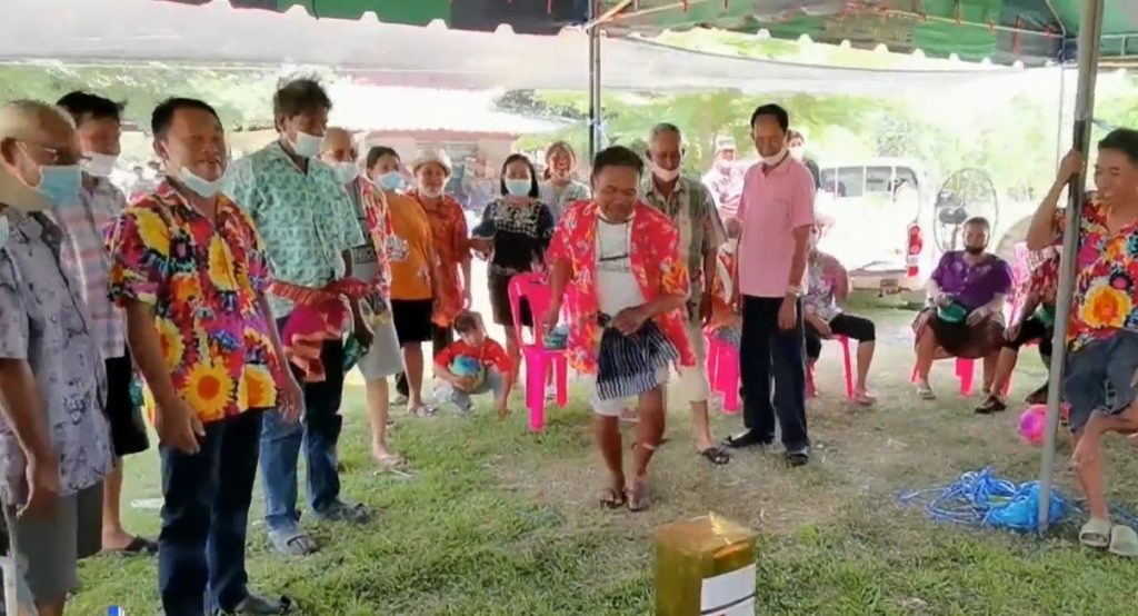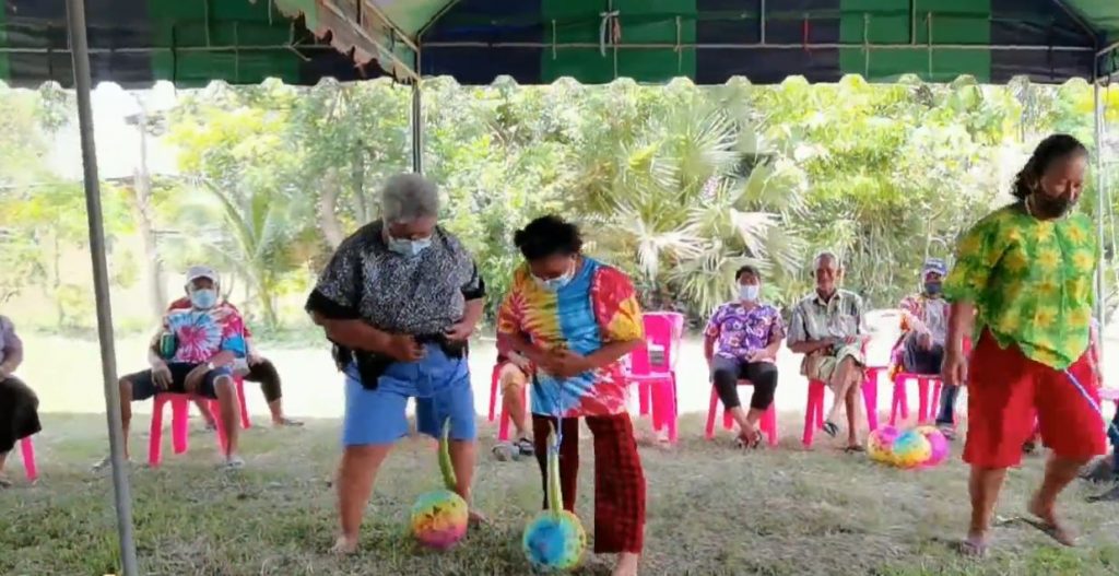 ราชบุรี 15 เม.ย. – ผู้สูงวัยชุมชนสามเรือน จ.ราชบุรี โชว์ลีลามะเขือยาว ชิงตำแหน่ง “เอวดี เอวสนั่น โยกสะบัด-เตะปี๊บทะยานฟ้า” ในงานกิจกรรมรดน้ำดำหัวผู้สูงอายุเทศกาลสงกรานต์