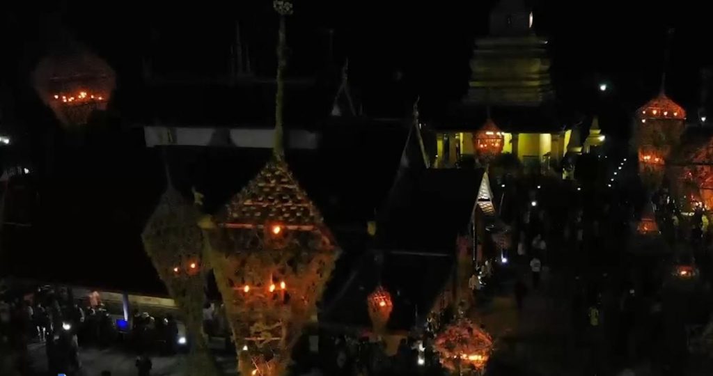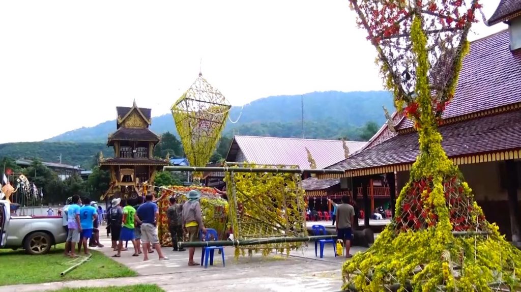 ต้นดอกไม้ของตำบลแสงภา จะมีลักษณะเด่นกว่าทุกวัด คือ มีขนาดใหญ่และสูง มีความกว้าง 3.50 เมตร สูง 15 เมตร โดยต้องทำให้เสร็จภายในวันเดียว ชาวบ้านผู้ชายจะตัดไม้ไผ่มาผูกเป็นโครง อุปกรณ์ที่ใช้ยึดจะมาจากธรรมชาติทั้งสิ้น ไม่มีการใช้ลวด หรือสิ่งอื่นใดที่ไม่ใช่ธรรมชาติ ส่วนผู้หญิงจะทำหน้าที่จัดหาดอกไม้จากต้นไม้ในหมู่บ้านมามัดรวมเป็นช่อๆ เพื่อการตกแต่ง ถือเป็นกิจกรรมที่แสดงให้เห็นถึงความศรัทธาในพระพุทธศาสนา และแสดงให้เห็นถึงความสามัคคีของชาวบ้านเป็นอย่างยิ่ง. – สำนักข่าวไทย