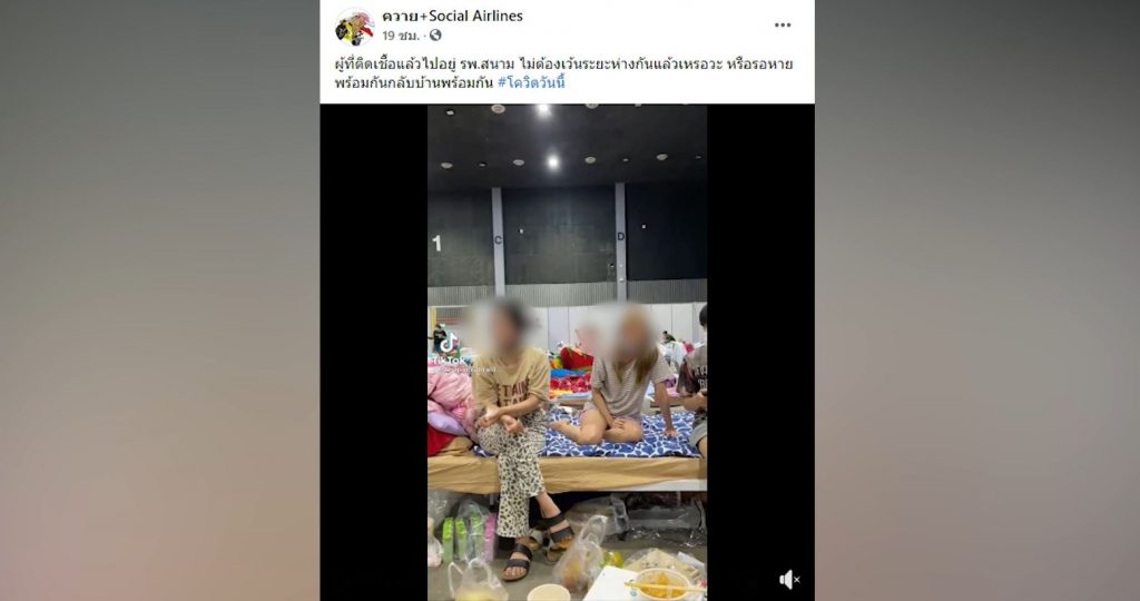 นอกจากนี้ ทางด้าน เพจ ควาย+Social Airlines ก็ได้เผยคลิป ขณะที่ผู้ติดเชื้อโควิด-19 ในโรงพยาบาลสนามแห่งหนึ่ง นั่งจับกลุ่มคุยกัน โดยไม่มีการเว้นระยะห่าง และไม่มีการสวมหน้ากากอนามัย ซึ่งทางเพจระบุข้อความว่า “ผู้ที่ติดเชื้อแล้วไปอยู่ รพ.สนาม ไม่ต้องเว้นระยะห่างกันแล้วเหรอ หรือรอหายพร้อมกันกลับบ้านพร้อมกัน”