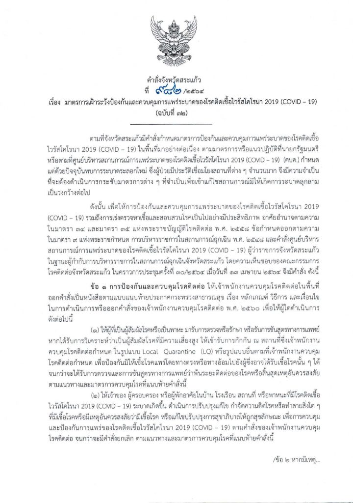 ภายหลังจากที่วานนี้ (15 เม.ย.) จ.สระแก้ว พบผู้ป่วยโควิด-19 เพิ่มอีก 17 ราย รวมผู้ติดเชื้อระลอกเมษายน ทั้งสิ้น 143 ราย ล่าสุดนายเกียรติศักดิ์ จันทรา ผู้ว่าราชการจังหวัดสระแก้ว ได้ลงนามในคำสั่งจังหวัดสระแก้ว ที่ 982/2564 ลงวันที่ 15 เม.ย.64 โดยความเห็นชอบของคณะกรรมการโรคติดต่อจังหวัดสระแก้ว ออกมาตรการป้องกันและควบคุมการแพร่ระบาดของโรคโควิด-19 เพื่อไม่ให้เกิดการระบาดลุกลามเป็นวงกว้าง ดังนี้