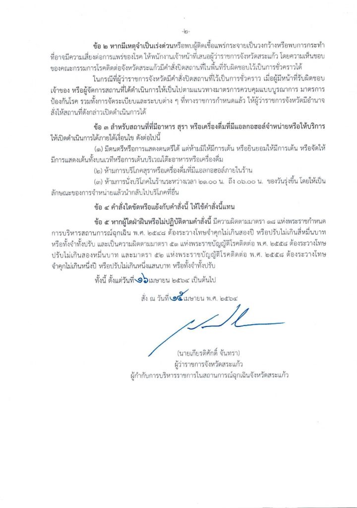 2.หากมีเหตุจำเป็นเร่งด่วนหรือพบผู้ติดเชื้อแพร่กระจายเป็นวงกว้างหรือพบการกระทำที่อาจมีความเสี่ยงต่อการแพร่ของโรค ให้พนักงานเจ้าหน้าที่เสนอผู้ว่าราชการจังหวัดสระแก้ว โดยความเห็นชอบของคณะกรรมการโรคติดต่อจังหวัดสระแก้ว มีคำสั่งปิดสถานที่ในพื้นที่รับผิดชอบไว้เป็นการชั่วคราวได้