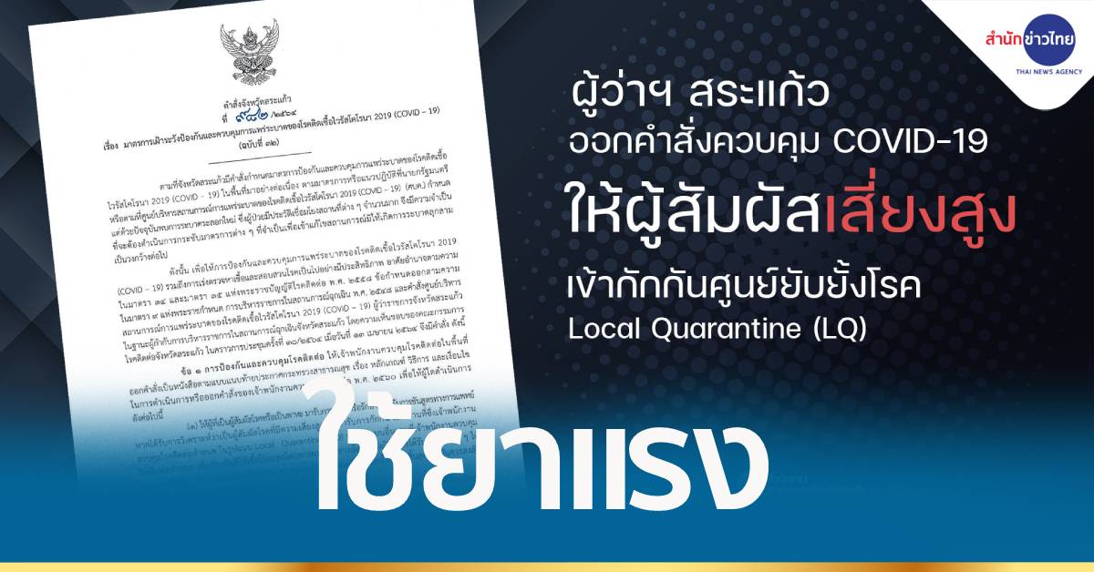 สระแก้ว 16 เม.ย.- ผู้ว่าฯ สระแก้ว ใช้ยาแรงสกัดโควิดลุกลามวงกว้าง ออกคำสั่งให้ผู้สัมผัสเสี่ยงสูงต้องเข้ากักตัวใน LQ จนกว่าจะตรวจไม่พบเชื้อแล้ว พร้อมสั่งห้ามจำหน่ายสุราในร้านอาหาร ให้นั่งทานอาหารได้ถึง 3 ทุ่ม หากฝ่าฝืนมีโทษทั้งจำคุกและปรับ มีผลตั้งแต่วันนี้เป็นต้นไป